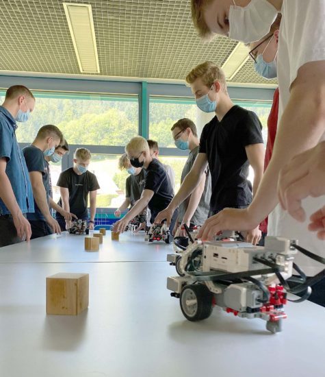 Anders als trockene Theorie motivierte der Roboter-Battle die Schülerinnen und Schüler dazu, ihre Programme zu optimieren, um mit ihren Fahrzeugen möglichst in Bestzeit den Hindernisparcours zu überwinden. Für viel Spaß beim Unterricht sorgte nicht nur die gute praxisnahe Lernsituation, sondern auch die gute Ausstattung der Fahrzeuge. Sie verfügen über drei Motoren, die einzeln angesteuert werden können, einen Farbsensor zur Helligkeits- und Farberkennung und einen Gyro-Sensor zur Ermittlung der Ausrichtung des Roboters in Grad, sowie einen Drucksensor, der auf Berührung reagiert.