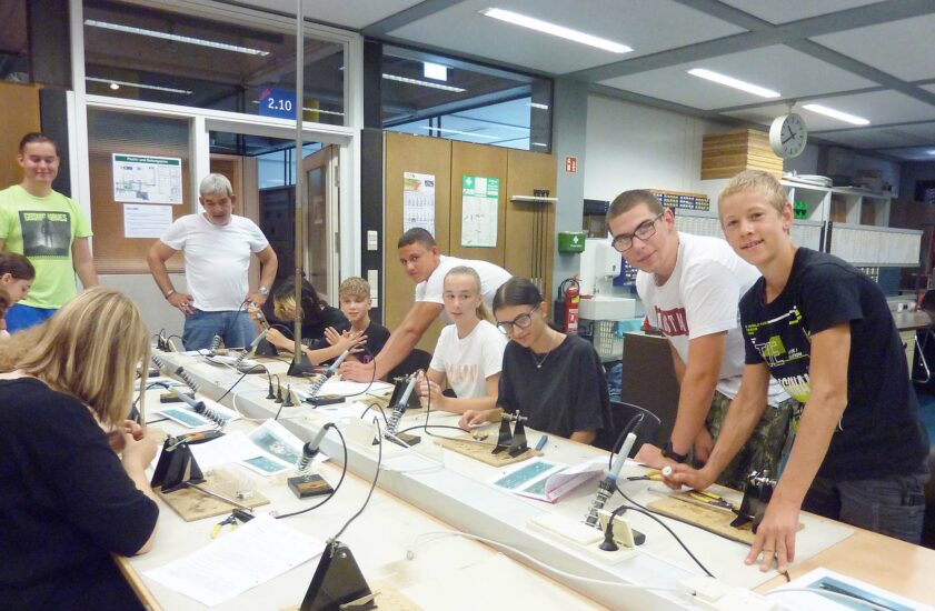 Die Schüler der Klasse 2BFE1 helfen den Gästen von der Graf-Heinrich-Schule beim Löten von Platinen für Taschenlampen. Foto: Dr. Hannelore Zimmermann