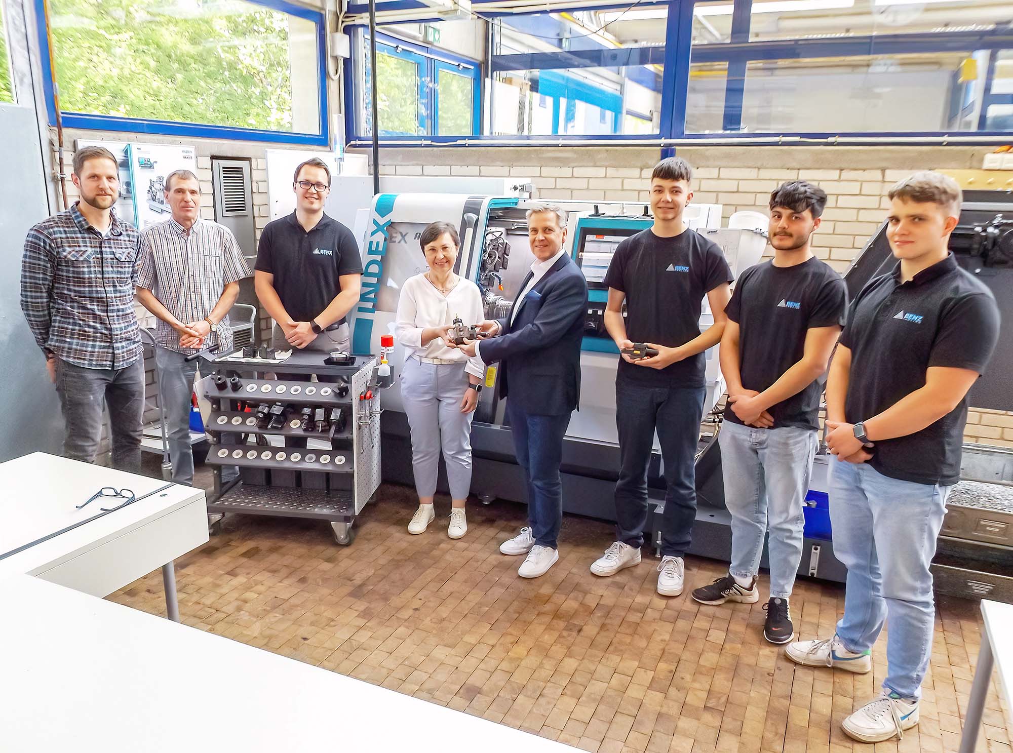 An dieser Stelle schaltete sich der duale Partner Benz Tooling aus Haslach ein. Durch den regelmäßigen Austausch zwischen Schule und Betrieb war die Anschaffung bekannt und als Lieferant für angetriebene und statische Werkzeugaufnahmen, sowie Wechselaggregate erklärte sich der Haslacher Betrieb dazu bereit, die Schule zu unterstützen. Benz-Ausbildungsleiter Ivo Reinberger beriet sich mit dem verantwortlichen Werkstattlehrer Thomas Feger über Art und Umfang der Aufnahmen. Industrie-, Werkzeug- und Zerspanungsmechaniker lernen an verschiedenen Werkstücken das CNC-Drehen. Der Bedarf der Werkzeuge musste also vorhandene Übungsteile, sowie eventuelle Neuprojekte abdecken können.