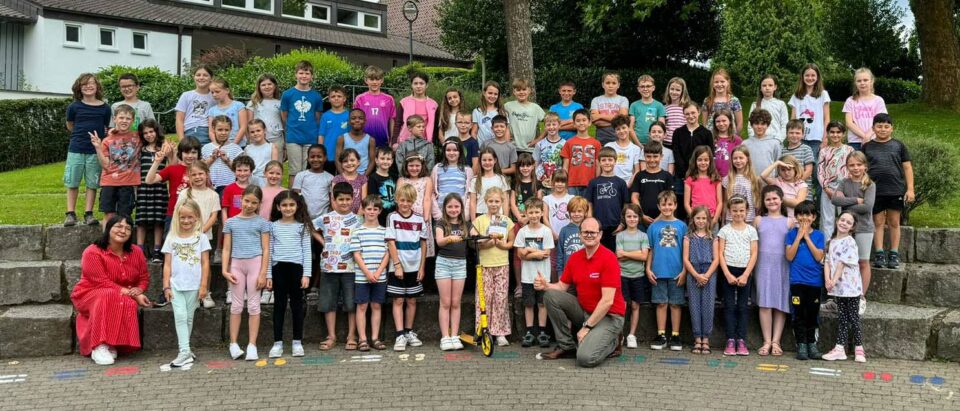 Kurz vor den Sommerferien hat auch Sebastian Lebek die Grundschule in Berghaupten besucht – mit einer Teilnehmerquote von rund 75 Prozent war die Schule in diesem Jahr eine der erfolgreichsten Schulen. „Bleibt so motiviert, ohne das Elterntaxi in die Schule zu gehen. Es lohnt sich immer“, gab der Sparkassenvorstand den Schülerinnen und Schülern mit auf dem Weg und machte gleich Werbung für das kommende Schuljahr. „Dann wollen wir zwischen den Oster- und Pfingstferien wieder ‚Sporteln, Spielen und Toben‘.“