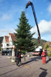 Der Betriebshof hat die großen Tannenbäume aufgestellt und verteilt am Donnerstag die kleinen Bäumchen für die Hausfassaden.