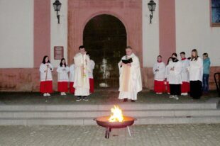 Zur Osternachtfeier am Sonntagmorgen versammelten sich ab 5.30 Uhr die Gläubigen um das Osterfeuer auf dem Kirchplatz.
