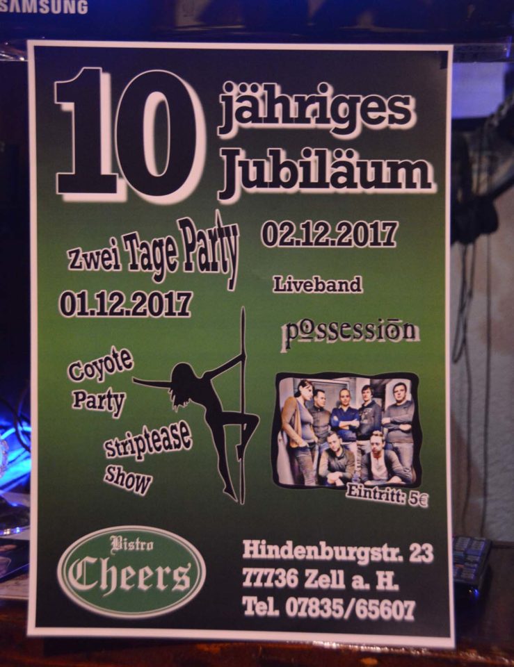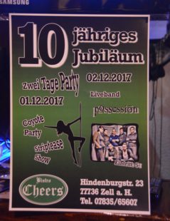 So hat man auch allen Grund, das 10-jährige Jubiläum mit einer tollen Party zu feiern. Los geht es am Freitag, 1. Dezember, mit einer Coyote-Party. Das In-Getränk wird bei einer Striptease-Show besonders prickelnd serviert. Am Samstag bietet Cheers-Wirt Turan den Gästen einen Geburtstags-Empfang und es gibt Freigetränke. An diesem Abend wird die Band »Possession« mit fetziger Live-Musik für beste Party-Stimmung sorgen. Bis in den frühen Morgen darf das Jubiläum gefeiert werden.