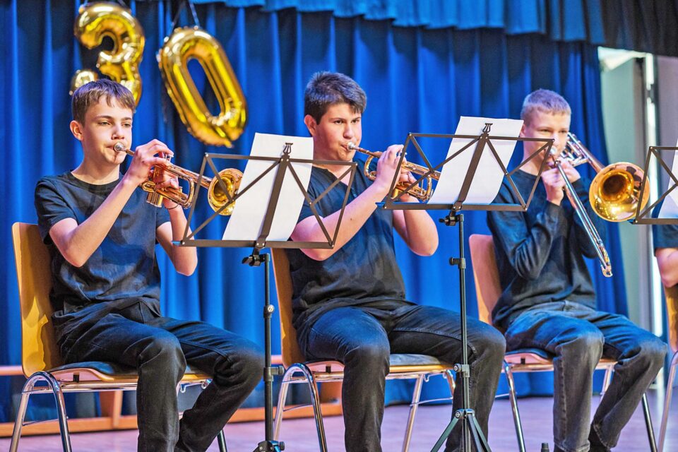 Ab der 3. Klasse kann ein Blasinstrument erlernt werden. Bei der Instrumentenvorstellung lassen sich verschiedene Instrumente aus nächster Nähe kennenlernen und ausprobieren.