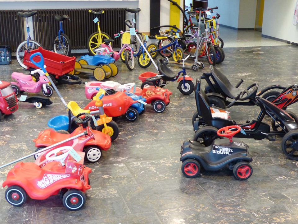 Wer ein Fahrrad zu Hause hat, das noch gut in Schuss ist, aber nicht mehr gebraucht wird, kann es zum Basar bringen und dort einen Käufer finden. Gleiches gilt für Kinderroller, Rutschautos, Kettcars oder Dreiräder, die nur unnötig im Keller rumstehen.