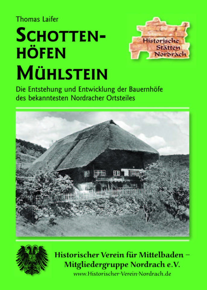 Thomas Laifer hat, unterstützt von Othmar Wolf und anderen Vereinsmitgliedern, erforscht, wo die Besiedlung des Nordracher Ortsteils Schottenhöfen und Mühlstein begann und wie sie sich dann immer mehr ausbreitete. In einem Geschichtsbuch mit dem Titel »Schottenhöfen/Mühlstein – Die Entstehung und Entwicklung der Bauernhöfe des bekanntesten Nordracher Ortsteils« hat er die Geschichte ab dem Jahr 650 eindrucksvoll dargestellt.