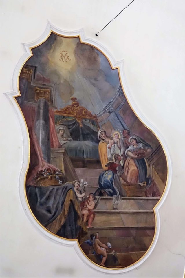 Ein Deckengemälde auf der linken Seite der Zeller Wallfahrtskirche zeigt eine Szene aus der Geburt. Die Hebamme zeigt das Kind hoch, dass es auch die Mutter Anna im Wochenbett sehen kann. Das Kind Maria ist mit Windeln umhüllt und sein Kopf ist mit zwölf leuchtenden Sternen umkränzt. Darüber erscheint das Monogramm des Namens Maria.